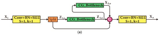 where split is the dimensional segmentation function, is the extraction of local feature operations, is the extraction of surrounding features operation, β+β represents the residual sum operation, and is the convolution normalization and activation function transformation. and are the global inputs and outputs, respectively. , are the local CG_ inputs and outputs on the bottleneck, respectively.