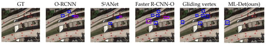 Comparison of the detection differences of YOLOv5s-obb (left) and ML-Det (right).