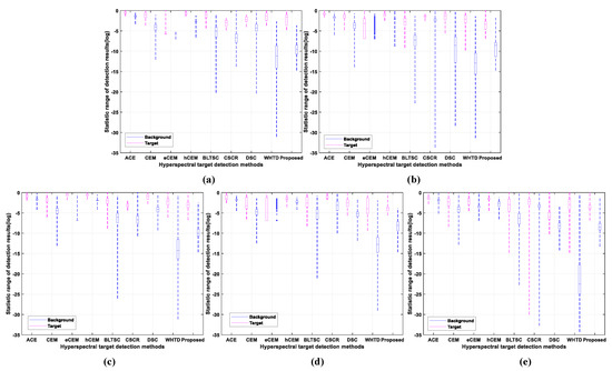 The separability analysis of different detectors on (a) HYDICE, (b) San Diego, (c) ABU−1, (d) ABU−2, and (e) ABU−3.