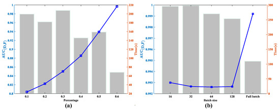 Effects of (a) percentage of input samples and (b) batch size with and computational cost. The and time are indicated with line and bar charts, respectively.
