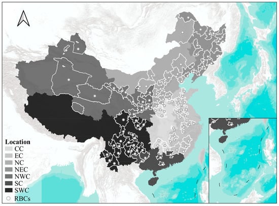 Distribution of RBCs in China and the geographic divisions of China. (CC: Central China; EC: East China; NC: North China; NEC: Northeast China; NWC: Northwest China; SC: South China; SWC: Southwest China).