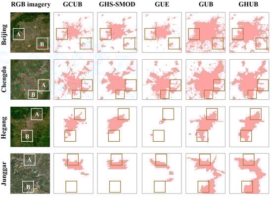 The datasets utilized in this study are publicly accessible. The GHSL data can be retrieved from https://human-settlement.emergency.copernicus.eu (accessed on 15 July 2024). The GUE data can be retrieved from https://dataverse.harvard.edu/dataset.xhtml?persistentId=doi:10.7910/DVN/79CRQJ (accessed on 15 July 2024). The GUB data can be retrieved from https://data-starcloud.pcl.ac.cn (accessed on 15 July 2024). The GHUB data can be retrieved from https://zenodo.org/records/5168383 (accessed on 15 July 2024). Correlation data that support the findings of this study are available upon request from the corresponding author.