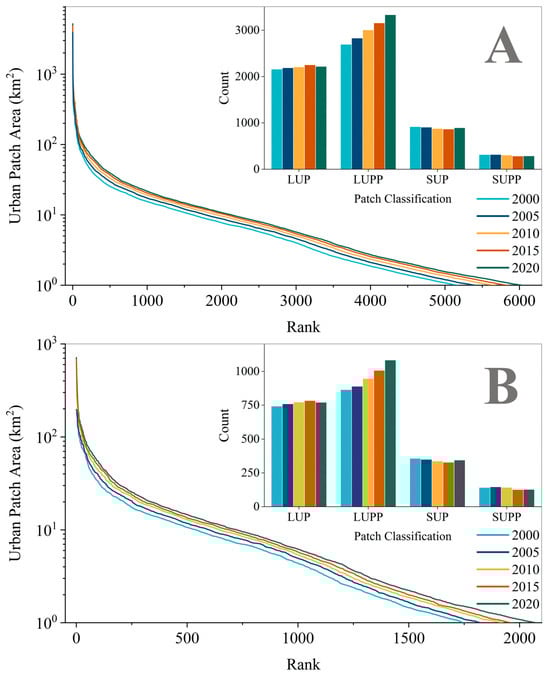 Trends in the expansion and number of urban patches in China from 2000 to 2020. (A): Overall statistics of China. (B): Statistics of RBCs.