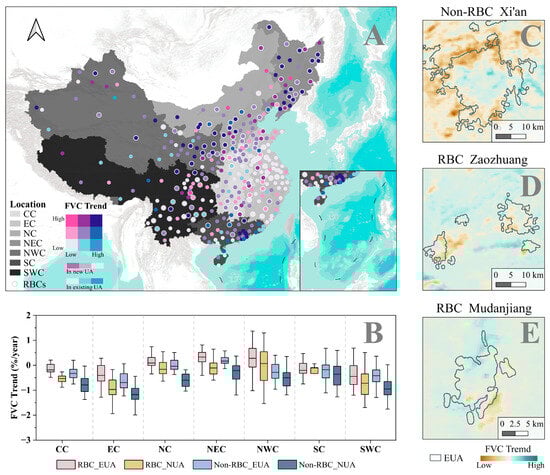 FVC trends within the EUA and NUA across different regions. (A): Distribution of the FVC trend across cities. (B): Spatial statistics of the FVC trend. (C–E): City examples.