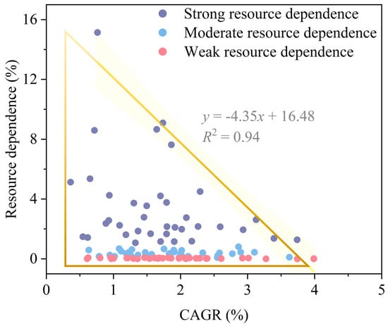 Since no new data were collected in 2020’s yearbook, we selected 2019 as the standard year, ultimately identifying the industry employment numbers in 115 RBCs to calculate the resource dependence. Statistical analysis showed that 37 cities had strong resource dependence, while 43 had moderate resource dependence. When analyzing the relationship between the type of resource dependency and GAGR, we observed that the Pearson correlation coefficient varied. The correlation coefficient for cities with weak resource dependence was −0.41, indicating a moderate negative correlation between resource dependency and GAGR. Cities with strong resource dependence showed a correlation coefficient of −0.31, also indicating a negative correlation. Moreover, cities with moderate resource dependence had a correlation coefficient of just 0.02, suggesting almost no correlation between resource dependency and GAGR. These findings indicated that varying degrees of resource dependency may impact urban growth rates differently. By plotting the relationship between urban expansion rates and resource dependency, we observed that the scatter distribution formed an approximate right-angled triangle (Figure 7). This distribution pattern suggests that there may be a trade-off and coexistence between resource dependency and urban expansion, necessitating that urban development strategies balance the two.