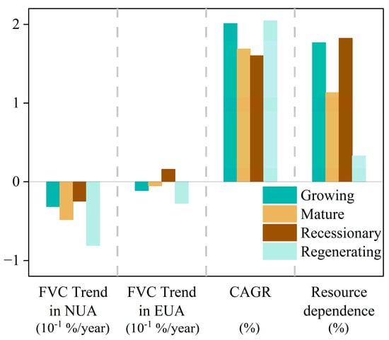 According to the Plan, China’s RBCs are categorized into four types as follows: mature (65 cities), growing (20 cities), recessionary (24 cities), and regenerating (16 cities). Several trends emerge by analyzing the average values of four key indicators, including the FVC trend in NUA, the FVC trend in EUA, CAGR, and resource dependence (Figure 8). Regenerating RBCs exhibit a higher CAGR and the lowest resource dependence, whereas recessionary RBCs show the opposite pattern. The FVC trend in NUA is negative for all four types of cities, particularly in regenerating cities, which reach −0.81%/year, followed by mature RBCs. Notably, recessionary RBCs exhibit a positive FVC trend in EUA, indicating a greening trend. These findings reveal the complex dynamics of vegetation cover change and economic transformation in RBCs.