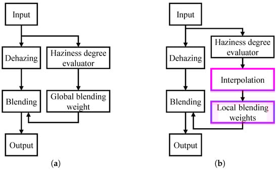 Simplified block diagrams of autonomous dehazing algorithms. (a) Lee et al. []. (b) Proposed algorithm. Major contributions are highlighted by pink boxes.