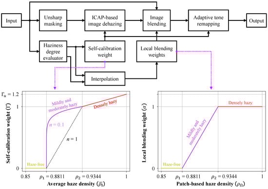 After the unsharp masking stage, the image undergoes dehazing based on the improved color attenuation prior (ICAP) []. The dehazing process is controlled by a self-calibration weight, derived from the average haze density. The image blending module then fuses the input image with the dehazed result using local weights calculated from the haze density map. Finally, the adaptive tone remapping module post-processes the blended result to compensate for dynamic range reduction, with guidance from the self-calibration weight.