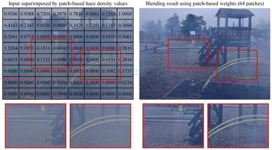 However, performing image blending using patch-based weights may introduce boundary artifacts. Figure 4 presents a hazy image (sourced from the O-HAZE [] dataset) alongside the corresponding blending result obtained using patch-based weights. The image was divided into patches and overlaid with the average haze density values for each patch, calculated as: