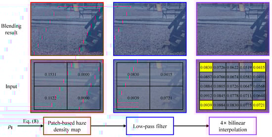 To address boundary artifacts, we propose an interpolation scheme wherein the patch-based haze density map is first passed through a low-pass filter and then subjected to bilinear interpolation. Figure 5 illustrates the proposed scheme using an image region from Figure 4, where abrupt changes in patch-based haze density values are observed, leading to boundary artifacts in the blending result.