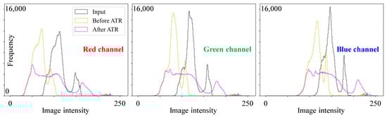 Histograms of red, green, and blue channels for the input image, as well as the images before and after ATR (adaptive tone remapping).