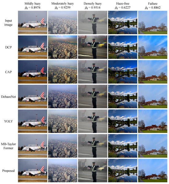 Qualitative evaluation of the proposed algorithm compared to five benchmark methods on images with varying haze conditions. The haze condition was determined by comparing the average haze density, , against two thresholds, and .
