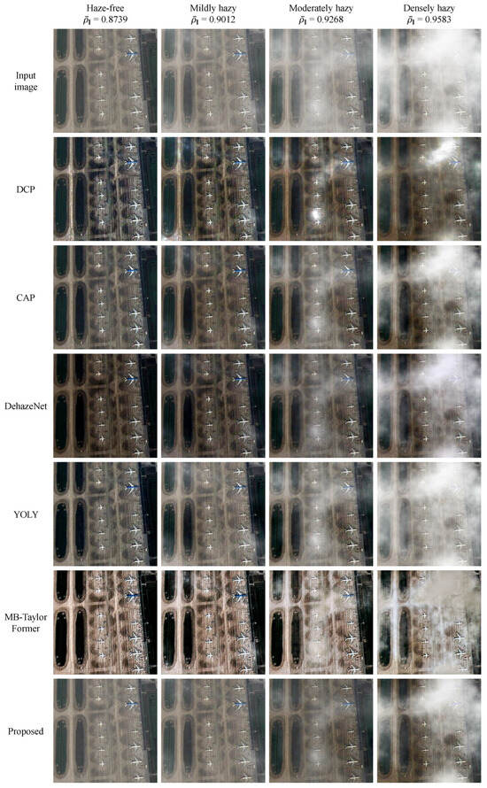 Qualitative evaluation of the proposed algorithm and five benchmark methods on an airport aerial image under different haze conditions. The haze condition was determined by comparing the average haze density, , against two thresholds, and .
