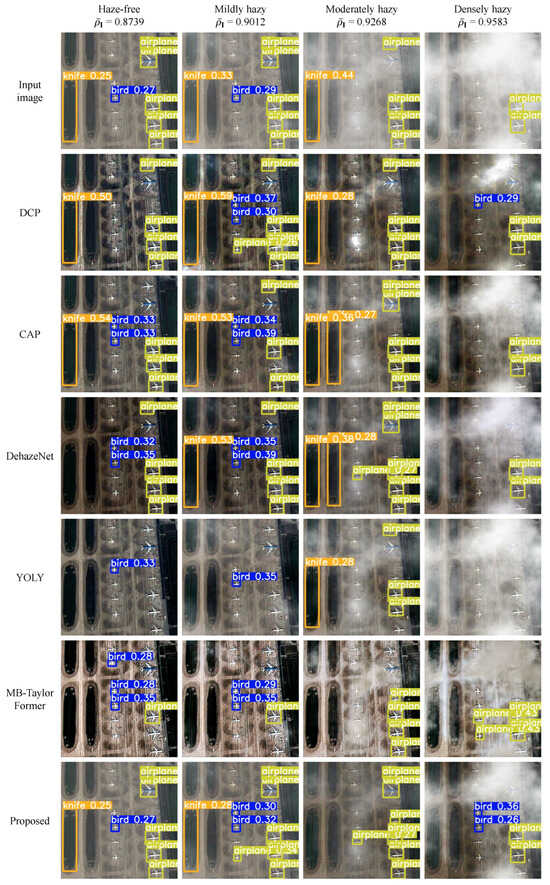 Detection results of the YOLOv9 object detection algorithm on an airport aerial image under various haze conditions. The haze condition was determined by comparing the average haze density, , against two thresholds, and . Notes: yellow labels represent airplanes, blue labels represent birds, and orange labels represent knifes.