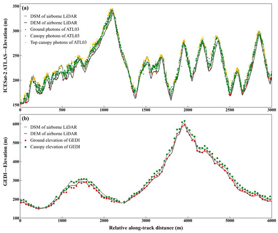 Profiles of spaceborne LiDAR data and corresponding ALS data along the tracks in mountainous region (a) ICESat-2 ATLAS, (b) GEDI.