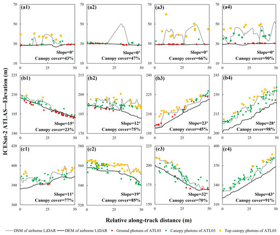 Comparison of ATLAS photons and ALS DSM and DEM among plain, hill, and mountain with different slopes and canopy cover levels. (a1–a4) different canopy levels in plain region; (b1–b4) different combinations of slopes and canopy covers in hilly region; (c1–c4) different combinations of slopes and canopy covers in mountainous region.