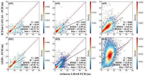 Comparison of spaceborne LiDAR FCH and corresponding ALS FCH (a and b represent ATLAS FCH and GEDI FCH; 1, 2, and 3 represent plain, hill, and mountain regions).