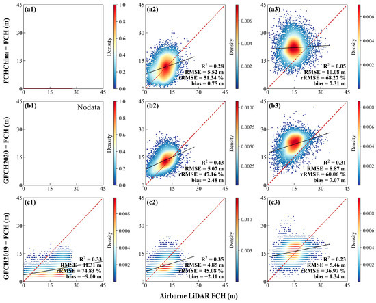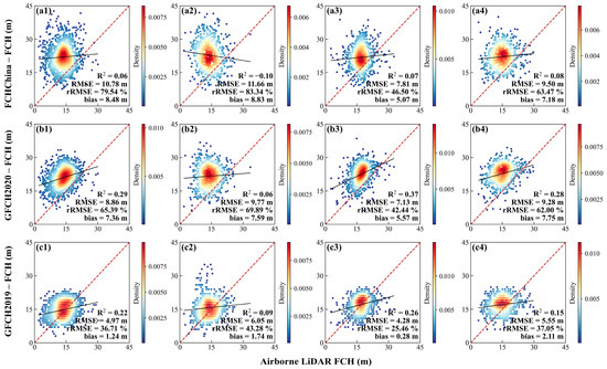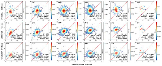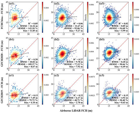 Assessment of wall-to-wall FCH products with ALS FCH under different canopy covers (a, b, and c represent FCHChina, GFCH2020, and GFCH2019; 1, 2, and 3 represent low, medium, and high canopy covers).