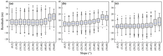 Residuals of three FCH products ((a) FCHChina, (b) GFCH2020, and (c) GFCH2019) at different slope intervals (Residual here is FCH maps—ALS referenced values).