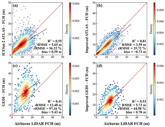 Comparison of original FCH and modified one using ALS data, (a) original ATLAS FCH, (b) improved ATLAS FCH, (c) original GEDI FCH, (d) improved GEDI FCH).