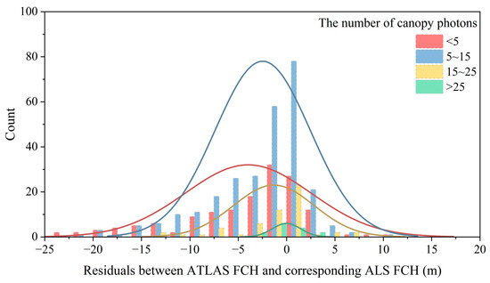Residual distribution of ATLAS FCH and ALS FCH under different canopy photon numbers in plain area.
