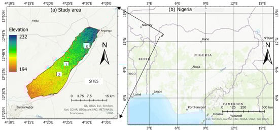 This area is situated between latitude 12°27′N and 12°47′N of the equator and longitude 4°15′E and 4°35′E (Figure 1a). This area is located in the Argungu local government area of Kebbi State, Nigeria. The area is renowned for its rice production and fishing in Nigeria. The climate in the area is tropical continental, with two distinct seasons: dry and wet. This is determined by the presence of two contrasting air masses, the tropical continental and the tropical maritime, which originate from the Sahara Desert and the Atlantic Ocean, respectively. The wet season is from May to October, while the dry season is from November to April. The average rainfall is 800 mm, and the average temperature is 27 °C, which can rise to 40 °C in the summer [35]. It is a floodplain with predominantly clayey and hydromorphic soils (e.g., clay, clay-loam, sandy-loam, loamy, sand, silty). The area is mostly characterized by lowland, with a few highland areas ranging between 194 to 344 m above sea level, dissected by large flowing rivers.