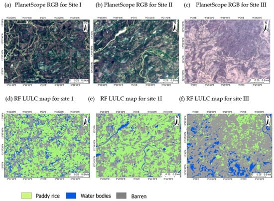 (a–f) depict the RGB composites for three sites within the study area, along with their corresponding. RF LULC maps from PlanetScope four bands, SAR and NDWI. (a) PlanetScope RGB for site I, (b) PlanetScope RGB for site II, (c) PlanetScope RGB for site III, (d) RF LULC map for site I, (e) RF LULC map for site II, and (f) RF LULC map for site III.