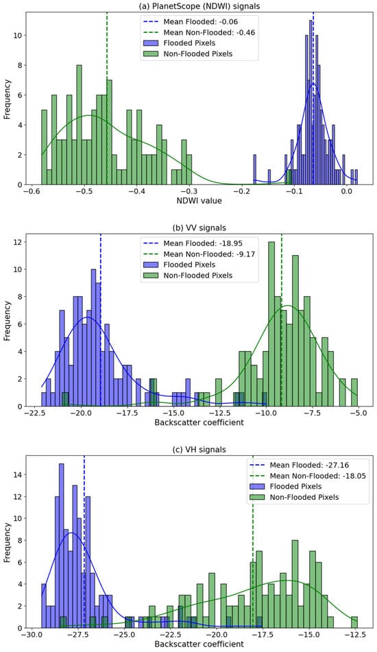 Figure 3a–c present the descriptive statistics and histogram distribution for the PlanetScope NDWI and Sentinel-1 VV and VH polarization. These statistics were derived from the mean values of each training polygon used for the flooded/non-flooded classification. The statistics include the count, mean, standard deviation, minimum, maximum, and quartiles (25th percentile, 50th percentile, and 75th percentile). The results show clear discrimination between the flooded and non-flooded signals. For the NDWI, the mean values are −0.06 for flooded pixels and −0.46 for non-flooded pixels (Figure 3a). The maximum values are −0.11 and 0.02, respectively, with the third quartile values being −0.05 for flooded and −0.40 for non-flooded pixels. This distinction arises because flooded pixels typically have higher NDWI values, reflecting more in the green band and absorbing more in the near-infrared (NIR) band. For the Sentinel-1 VV backscatter, the mean values are −9.17 for flooded pixels and −18.95 for non-flooded pixels (Figure 3b). The maximum values are −5.08 and −9.98, while the third quartile values are −7.93 and −18.38, respectively. Similarly, the Sentinel-1 VH backscatter shows mean values of −18.05 for flooded pixels and −27.16 for non-flooded pixels, with maximum values of −12.41 and −15.70 (Figure 3c). The third quartile values are −15.70 for flooded and −26.88 for non-flooded pixels. Overall, the Sentinel-1 data reveal that flooded areas have lower backscatter values compared to non-flooded areas, where vegetation or other structures cause higher backscatter. This leads to distinct backscatter characteristics for flooded versus non-flooded areas, despite some mixed pixels (Figure 3a,b).