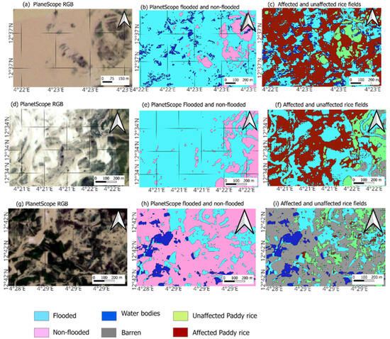(a–i) RF flooded and non-flooded layers overlaid by water bodies, affected and unaffected rice fields, from the subsets of the full scenes (zoom in from the three sites shown on the study area map).