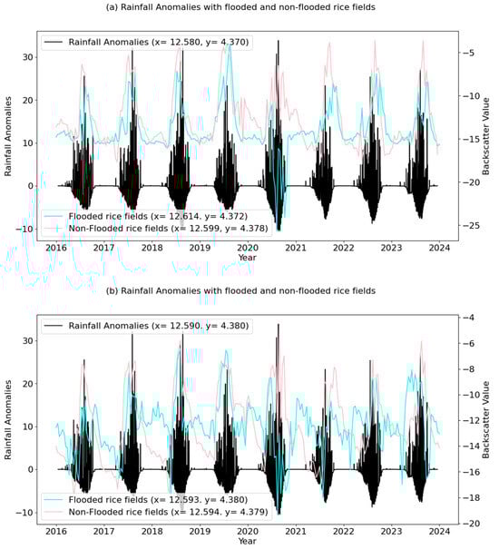Sentinel-1 VV signals of the paddy rice fields of flooded/non-flooded rice fields and their corresponding rainfall anomalies (2016–2023). (a) Flooded/non-flooded rice fields and rainfall anomalies for the three locations shown on the graph. (b) Flooded/non-flooded rice fields and rainfall anomalies for the three locations shown on the graph.