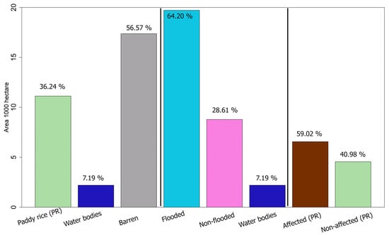 Figure 6 shows the area in 1000 ha and percentages for each LULC flooded/non-flooded and affected/non-affected area. According to the most accurate LULC RF classification, out of the total 30,702.71 ha of land, 11,125.15 ha are occupied by paddy rice fields (36.24%), 2207.41 ha by water bodies (7.19%), and 17,370.15 ha by barren land (56.57%). The flood extent, as determined using the PlanetScope high-resolution RF classification, is 19,712.6 ha (64.20%) for flooded areas and 8782.9 ha (28.61%) for non-flooded areas. The flood extent estimates include the area already occupied by water before the flood occurs. The damaged area for paddy rice fields is 6566.34 ha, which corresponds to 59.02% of the rice fields. The area in hectares and percentages for each LULC/flood extent, and the damage to paddy rice fields.