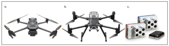 Drone platforms and sensors. (a) DJI Mavic 3 Multispectral (Mavic 3M), (b) DJI Matrice 350 RTK (Matrice 350), (c) Micasense RedEdge-MX Multispectral Dual-Camera System (Micasense) and downwelling light sensor (DLS).