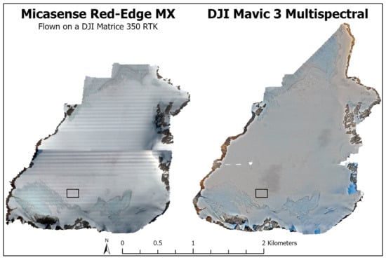Orthomosaic images of the Lemon Creek Glacier, Juneau Icefield, Alaska, derived from images captured by the RGB bands (Band 5: Red-668, Band 3: Green-560, and Band 2: Blue-475) of the Micasense RedEdge-MX dual camera system (left) and the RGB camera on a DJI Mavic 3 Multispectral (right) collected from 21 August through 23 August 2023. The black rectangle toward the southern end of the Lemon Creek glacier depicts the high density algae area used for analysis in Figure 5. (Map projection: WGS 1984 UTM Zone 8N).