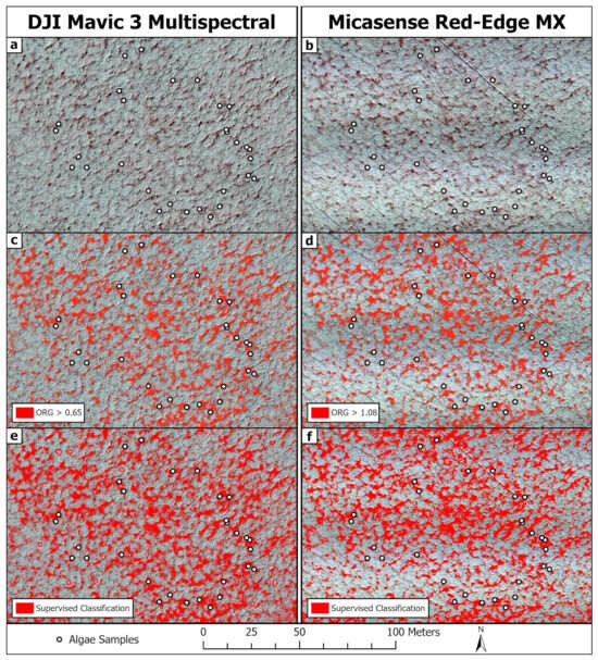 The accuracy of each classification was calculated by dividing the number of algae samples that intersected with each of the classifications by the total number of algae samples. For the Mavic 3M, the classification accuracy of the ORG index was 83% and the classification accuracy of the random forest classifier was 93%. For the Micasense orthomosaic, the classification accuracy of the ORG index was 97% and the classification accuracy of the random forest classifier was 100% (Table 1).