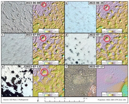 RGB orthomosaics and DEMs of a snow surface to the west of Upper Bagley Lake, within Bagley Basin, derived from DJI Mavic 3M imagery captured on (a) 8 June 2023, (b) 26 June 2023, (c) 5 July 2023, (d) 10 July 2023, (e) 13 June 2023, and (f) 17 July 2023. The red circle denotes an individual who’s diameter was measured to assess changes to suncup morphology.