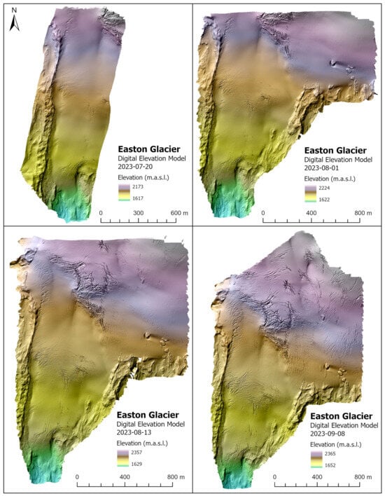 Digital elevation models of Easton glacier, captured by Mavic 3M mapping surveys on 20 July, 1 August, 13 August, and 8 September 2023. (Map projection: WGS 1984 UTM Zone 10N).