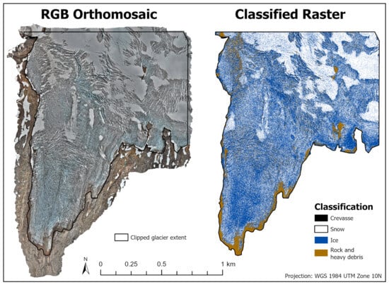 Based on a random forest supervised classification of the 13 August 2023, orthomosaic image, ice covered the greatest area within the clipped glacier extent at 802,947 m2, or 49.8% of the total glacierized area (Table 2). Snow covered the second largest area at 637,576 m2, or 39.6% of the total glacierized area (Table 2). Rock and heavy debris covered 144,553 m2, or 9.0% of the total glacierized area (Table 2). Finally, crevasses covered 26,891 m2, or 1.7% of the total glacierized area (Table 2).