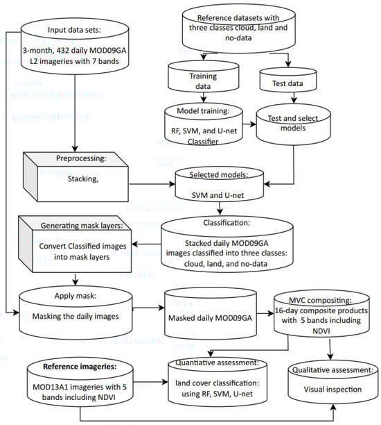 Hence, inspired by the existing limitations of the cloud-removal and pixel-based compositing approach, primarily related to the large spatial extent and multi-temporal data of high-temporal-resolution sensors, we propose a new single-rule-based compositing approach by generating our cloud mask. We employed maximum-value compositing techniques to derive 16-day MODIS composite products using daily MOD09GA Level 2 (L2) MODIS imageries, as shown in Figure 1. In order to mask cloud and no-data regions, we generated cloud mask layers from classified daily imageries by mapping the cloud-contaminated and no-data value pixels to −0.999999 and all uncontaminated pixels to 1. Then, the mask layers were utilized to mask the corresponding daily imageries by setting the masked pixels (cloudy and no-data) to −0.999999 while maintaining the original pixel values for the unmasked areas using the “np.where” function of the Python programming language. Subsequently, the masked imageries were composited by selecting the maximum value to generate 16-day MODIS composites for three seasons, for our target region covering Central, Eastern, and North Eastern Africa, and part of the Middle East, and requiring nine MODIS tiles to cover the area. Finally, we assessed the quality of our composite products quantitatively and qualitatively by comparing them with the reference MOD13A1v061 16-day composite products, which comprise an equal number of bands (5) as our products. Based on the land-cover classification accuracy, our products yielded a significantly higher accuracy (5–28%) than the reference MODIS product across three classifiers (RF, SVM, and U-Net), indicating the quality of our products and the effectiveness of our techniques. Moreover, a visual comparison shows that our products are more homogenous, radiometrically consistent, less noisy, and have fewer salt-and-pepper effects than the reference composite product.
