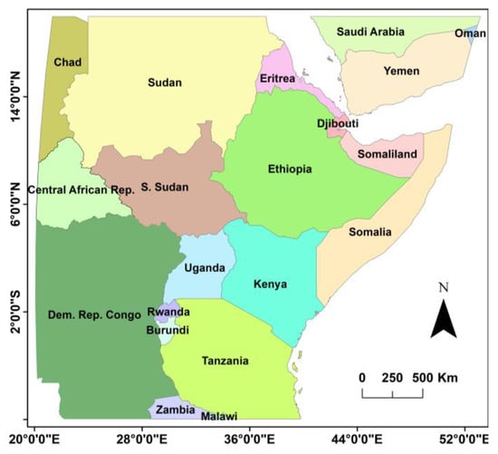 In order to conduct our experiments and collect the input MODIS imageries, we selected a region (see Figure 2), covering Central, Eastern, and North Eastern Africa, and part of the Middle East was selected. The region is characterized by a diverse range of climates, including tropical rainforests known for their persistent cloud cover, arid zones such as the Sahara, Sahelian, tropical, and equatorial climates, and various land-cover types such as forest, shrub, grassland, wetland, and bare land, and water bodies. The study area is selected not only because it includes regions with continuous cloud cover and rich biodiversity but also because it contains the second-largest tropical forest in the world, which plays a significant role in mitigating global climate change and environmental impacts. In addition, the existence of desert land and water bodies (lakes, seas, and oceans) in the region allows us to evaluate the effectiveness of our methods comprehensively. Owing to the extensiveness of the region, mosaicking nine tiles of MODIS images within h20v07 to h22v09, i.e., between horizontal (h) tile numbers 07–09 and vertical tile numbers (v) 20–22, is required to cover the entire area.