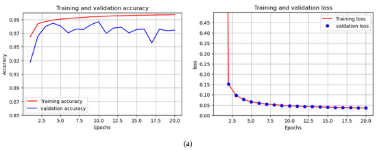 Regarding the U-Net segmentation model, we conducted several tests to obtain the optimum model by optimizing the various parameters such as weight and biases, and fine-tuning the hyperparameters (learning rate, batch size, number of epochs, number of hidden layers, and number of neurons in each layer). During experimentation, to control the learning process and avoid overfitting, we employed early stopping criteria with a patience of 10, which monitors validation losses, and we set the number of epochs to 150. In addition, to determine the number of convolutional layers in the encoding units, we experimented with U-Net models comprising 4, 5, and 6 CNN layers by setting the learning rate (0.0001) and a batch size of 32. Although the models achieve a similar overall accuracy (0.99) and k (98), they exhibit notable variations in their training and validation accuracy graphs, as well as in their training and validation loss graphs, as shown in Figure 4. Based on these graphs, we selected U-Net models with 5 convolutional layers (see Figure 5) as they demonstrated more stable/consistent training and validation accuracy graphs, and they appear to be the optimal model. This model is neither a little underfit as the model with 4 CNN layers is nor a little overfit as the one with 6 CNN layers is, which also has a higher loss.