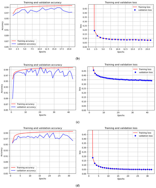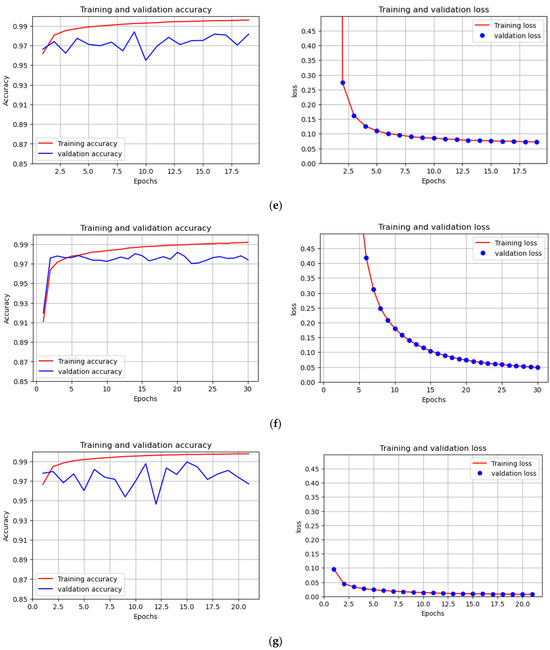 Training and validation accuracy graphs, and their respective training and validation loss graphs, of various U-Net models. (a–c) Models with 4 CNN layers, 5 CNN layers, and 6 CNN layers, respectively, and a learning rate of 0.0001 and batch size of 32; (d) 5 CNN layer models, similar to Model b, but the number of filters in each layer is reduced by half; (e) Model similar to Model b, but a higher number of batches (64) were used; (f) 5 CNN layers as in Model b, but a lower learning rate (0.00001); (g) The model is the same as Model b with 5 CNN layers but without kernel regularization (L1 and L2).