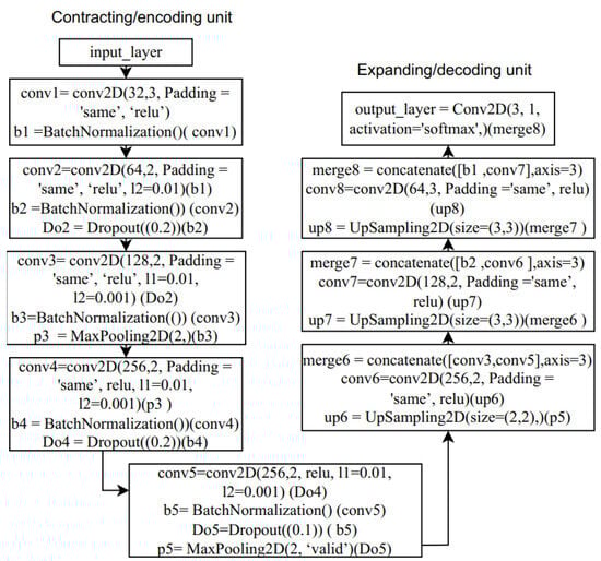 Once we obtained the optimum CNN layers/depth, we conducted further tests to fine-tune the model by varying the number of filters, batch size, and learning rates, as well as to see their impacts and the effect of kernel regularization (L1 and L2) (see Figure 4d–g). In terms of performance, the model showed no improvements; instead, it exhibited a varying degree of underfitting/instability. Therefore, the optimum U-Net model with 5 convolutional layers (see Figure 5) was chosen for the task.