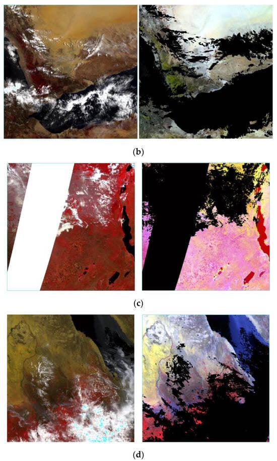 Daily MOD09GA L2 imageries from various locations (Column 1) and their respective masked imageries (Column 2), clouds, and no-data pixels are masked. All imageries (a–d) but c of the 2nd column are false-color composites of NIR, red (Band 1), and green (Band 4). (a) MOD09GA.A2019197.h20v08.061.2020303164214.hdf and the corresponding masked image; (b) MOD09GA.A2019193.h22v07.061.2020303114043.hdf and the corresponding masked image; (c) MOD09GA.A2019207.h20v09.061.2020304034526.hdf and the corresponding masked image with false-color-composite of bands (5, 2, 1) to show water bodies which are not masked, (d) MOD09GA.A2019207.h21v07.061.2020304034241.hdf and the respective masked image.