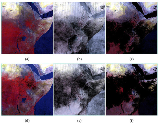 Maximum-value, mean, and median composite products that were generated using imageries collected over two seasons, April–May (1st row), and July–August (2nd row). (a,d) MVC; (b,e) mean compositing; (c,f) median compositing. The products are presented as a false-color composite of Bands 2, 1, and 3.