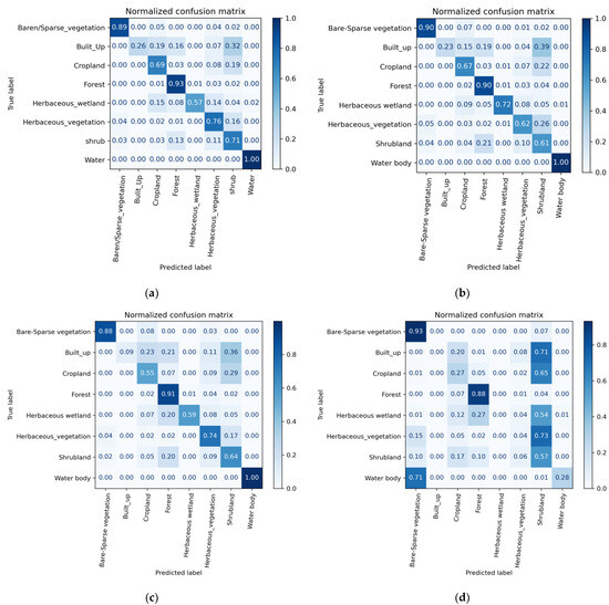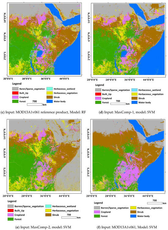 Furthermore, the variations in the quality of the input datasets are manifested in the land-cover maps generated by the same classifiers as Figure 10 elucidates. For instance, when MaxComp-1 was used as an input, the three classifiers (RF, SVM, and U-Net) generated land-cover maps revealing minor variations (see Figure 10a,d,g) in which all eight classes were predicted. However, land-cover maps generated from MaxComp-2 and the reference composite product (MOD13A1) show remarkable discrepancies across the classifiers, including missing classes (see Figure 10b,c,e,f,h,i). In particular, when the SVM classifier was employed to classify MaxComp-2, only seven classes were predicted out of eight, and one class (water body) was misclassified as bare–sparse vegetation (see Figure 10e). Likewise, when the reference composite product (MOD13A1) was classified using the SVM model, only six classes were predicted out of eight, while two classes (built-up, and herbaceous wetland) were completely missed (see Figure 10f).