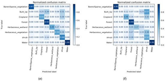 Confusion matrices depicting the performance of our best composite product (MaxComp-1) (1st column) and the reference composite product (MOD13A1) (2nd column) across three different classifiers. (a) Input: MaxComp-1, Model: RF; (b) Input: MOD13A1, Model: RF; (c) Input: MaxComp-1, Model: SVM; (d) Input: MOD13A1, Model: SVM; (e) Input: MaxComp-1, Model: U-Net; (f) Input: MOD13A1, Model: U-Net.
