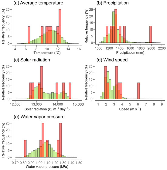 Distribution of climate factors for the 8 Calibration/Validation (Cal/Val) site grids and other grids. Cal/Val sites are colored in red; complete South Korean forest grids are colored in green.