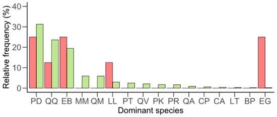 Distribution of dominant tree species on the grids at the Calibration/Validation (Cal/Val) site and other grids. The tree species with the largest area of distribution for each grid is the dominant tree species for that grid. The red bars are Cal/Val sites; green bars are complete South Korean forest grids. Among the 32 taxa, only 16 taxa with a dominant frequency of 0.1% or more in the entire grid were indicated in the plot (PD: Pinus densiflora, QQ: Quercus sp. forest, EB: broad-leaf forest, MM: mixed forest, QM: Quercus mongolica, LL: Larix kaempferi, PT: Pinus thunbergii, QV: Quercus variabilis, PK: Pinus koraiensis, PR: Pinus rigida, QA: Quercus acutissima, CP: Chamaecyparis obtusa, CA: Castanea crenata, LT: Liriodendron tulipifera, BP: Betula pendula, EG: evergreen forest).
