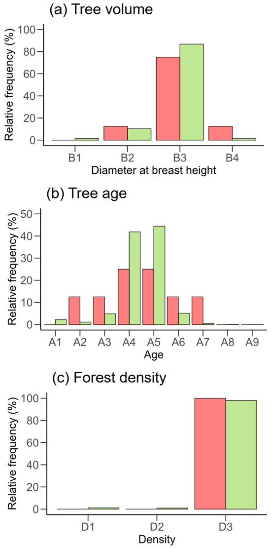 The distance by forest structure was 0.09 ± 0.09, which tended to be low overall (Figure 6d). This is because the current Cal/Val sites have an even distribution of forest structure, except for the two extremes (old, high naturalness, very high-volume forests/low naturalness, i.e., low density, age, and volume forests).