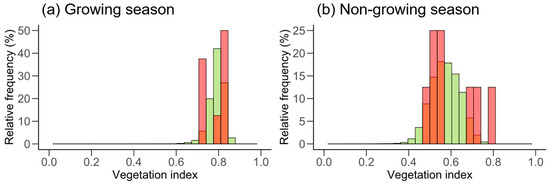 The vegetation index at the Cal/Val sites did not cover the full range of vegetation indices found in South Korean forests (Figure 5). In forests in South Korea, the normalized difference vegetation index (NDVI) for the growing season was monotonically distributed, with values above 0.66 accounting for 99% of the range, 0.80 being the lowest value, and a maximum of 0.88. Similarly, the NDVI for the non-growing season was monotonically distributed, with values above 0.48 occurring 99% of the time, 0.57 being the minimum value, and 0.82 being the maximum. However, at the Cal/Val sites, the NDVI values for the growing season ranged from 0.84 to 0.72, with values of 0.80, 0.73, 0.68, and 0.56 to 0.49 in the non-growing season. These values do not cover the entire range of minimum values and only partially reflect the distributions observed in South Korean forests.